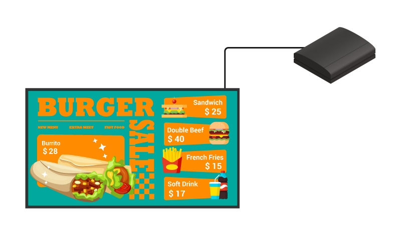 Alternatively, a standalone media player or mini-PC can be connected to any compatible display. This approach provides maximum flexibility—allowing you to use nearly any CMS platform, scale your system easily, and update or replace hardware components as needed. Though it involves more cabling and setup, it’s a strong option for larger chains or advanced use cases.