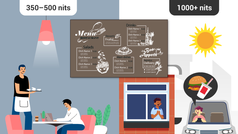It’s important to choose screens based on their installation environment. For indoor use, a brightness level of 350–500 nits provides sufficient visibility without being overly intense. For outdoor or drive-through settings, displays should be weatherproof, equipped with anti-glare technology, and offer a brightness of at least 1000 nits to ensure readability even in direct sunlight.