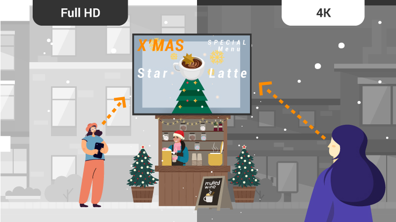 Most quick-service restaurants can rely on Full HD (1080p) resolution to deliver sharp visuals and easy-to-read text. However, if your site uses large-format displays or screens positioned at a greater viewing distance, opting for 4K resolution can offer improved clarity and a more high-end, professional look.