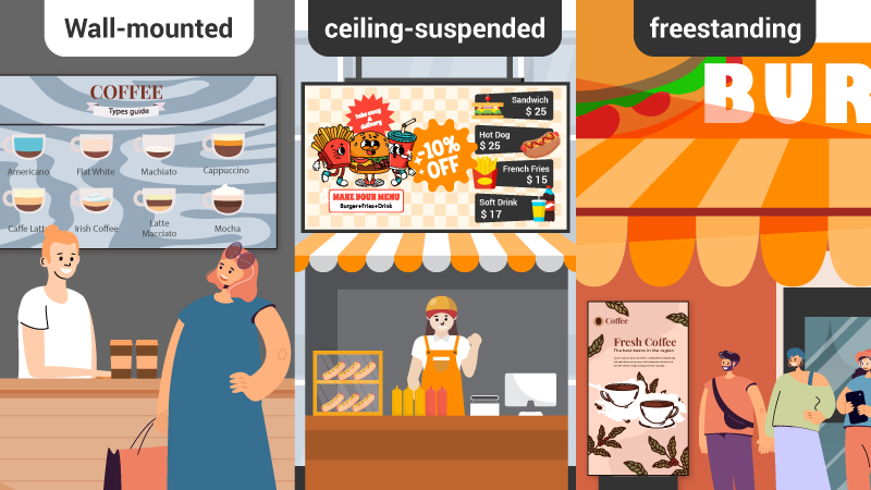 The way your screens are mounted has a direct impact on visibility and space efficiency. Wall-mounted displays are typically used for above-counter menus, ceiling-suspended screens are ideal for tighter areas, and freestanding digital kiosks work well at entrances or along customer queues. Choose a mounting style that aligns with your venue’s layout and foot traffic patterns.