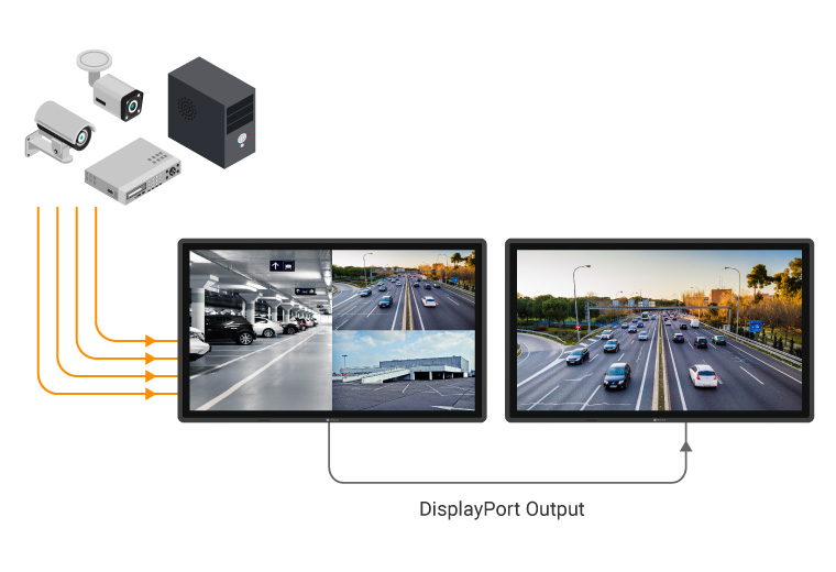 The DisplayPort daisy-chain function allows one QX display to share its active on-screen sources with the following unit, enabling scalable visual configurations with minimal cabling.