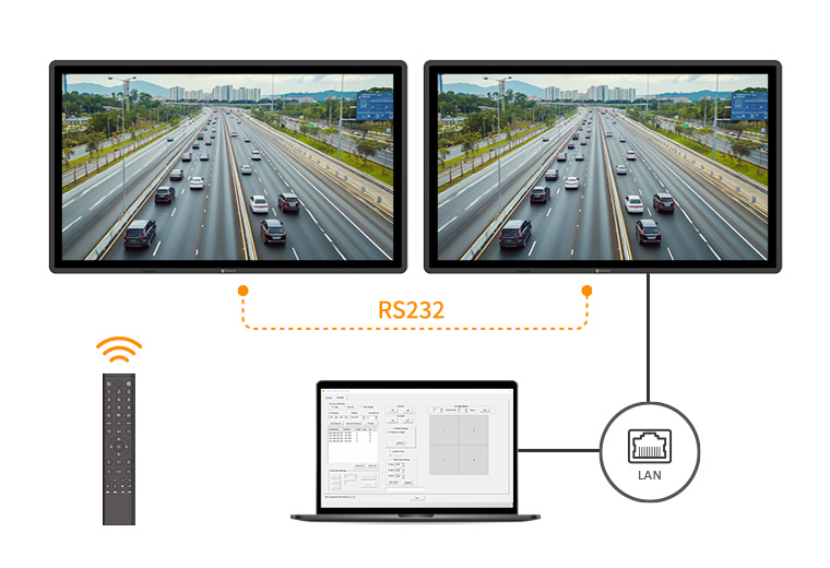 Control multiple displays as one through RS232 loop-through, keeping key settings aligned across units. When remote access is required, LAN control enables configuration over IP. Fully compatible with Neovo Controller for simple, unified management.
