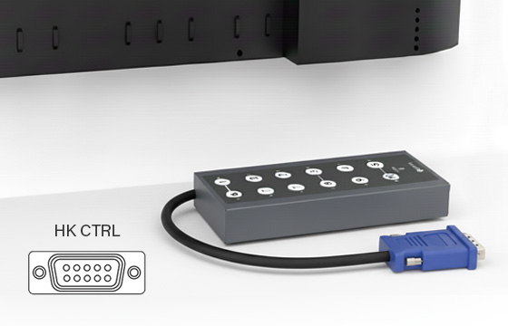 A standard 15-pin D-sub port enables connection to a pre-defined keypad for instant access to essential functions, including blackout, backlight, volume, power, input source, and screen layout.