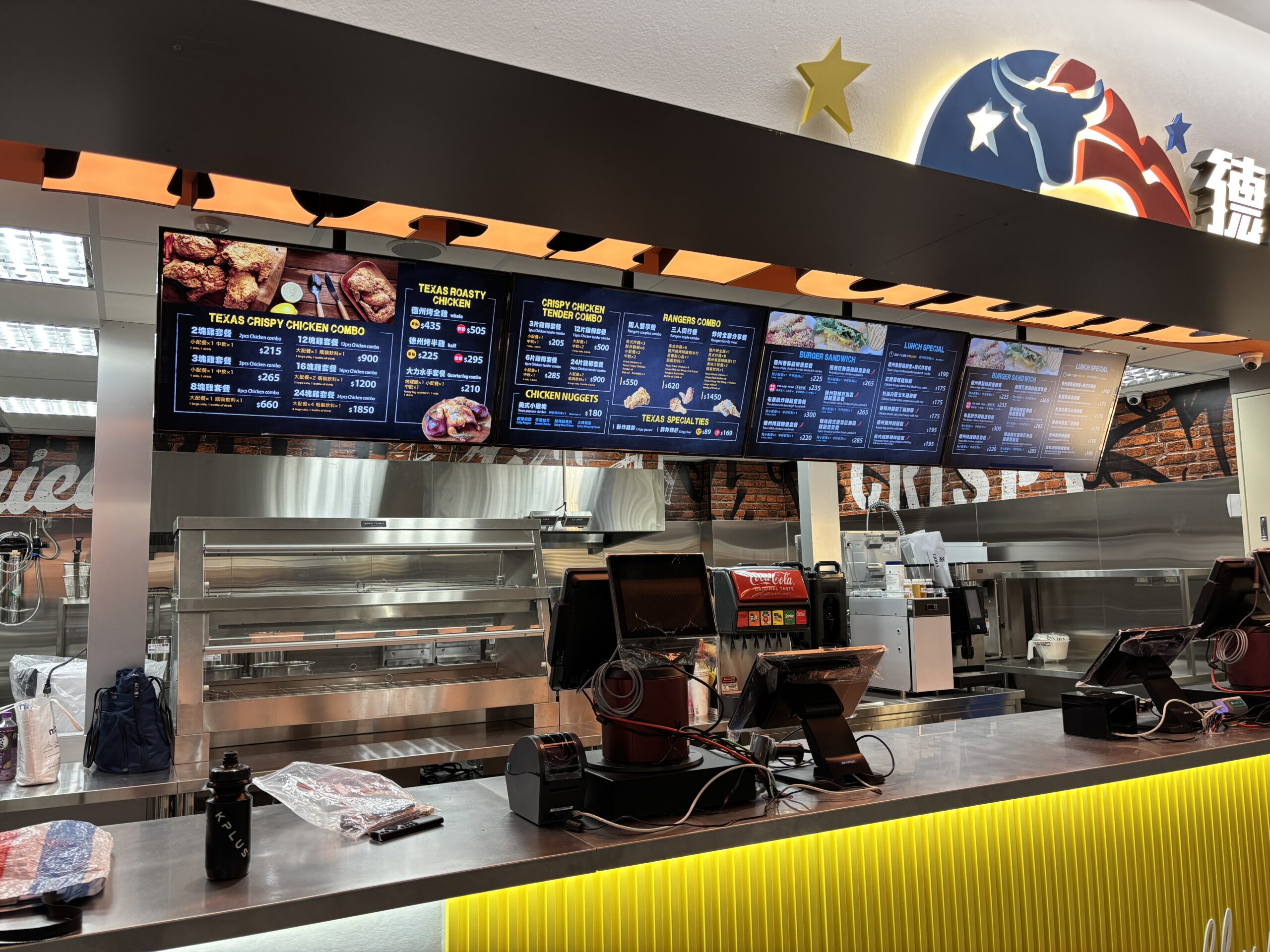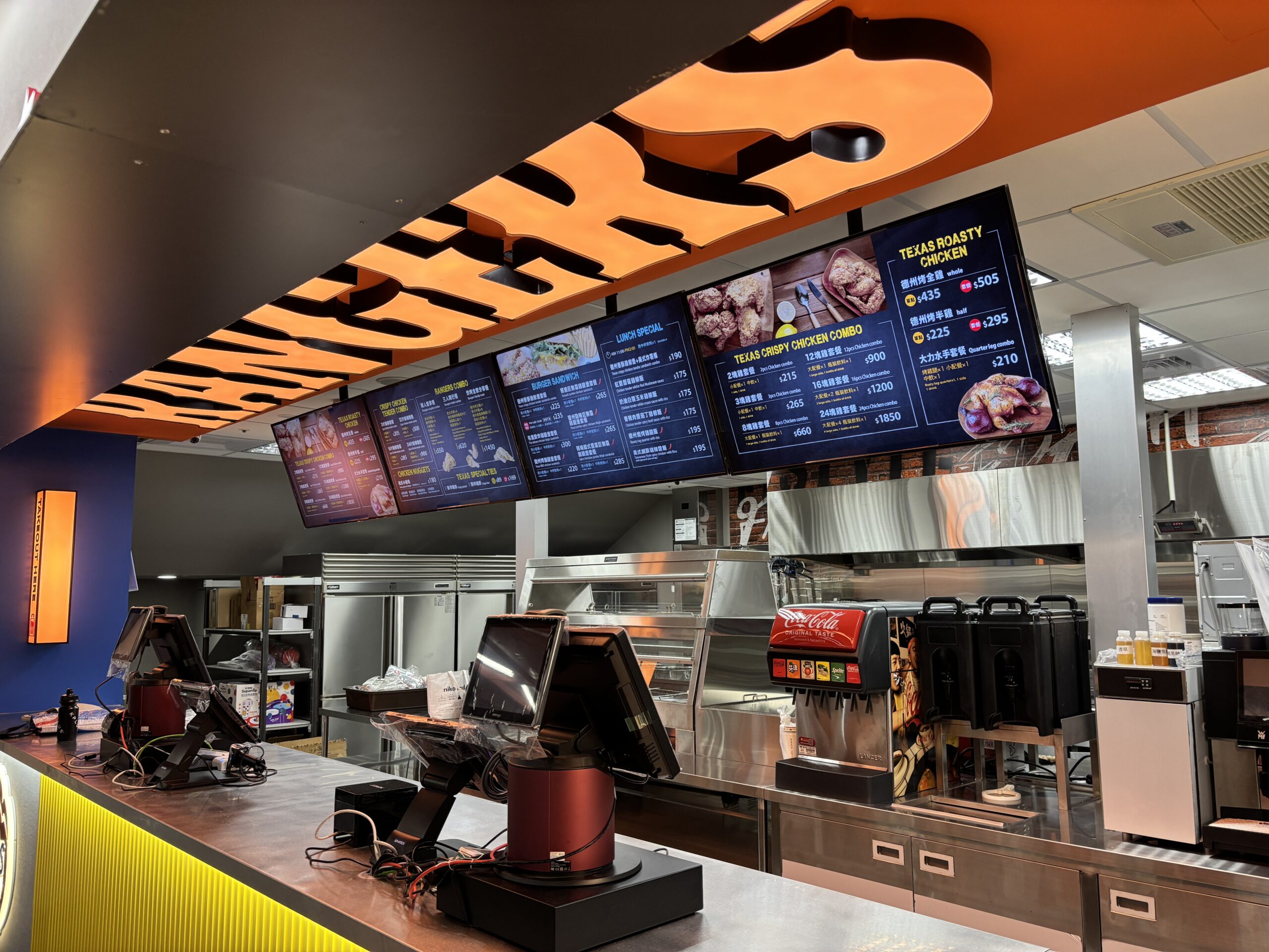 AG Neovo 與阿美設計團隊合作,為 RANGERS Dream Plaza 分店導入NSD-4303 43 吋 All-in-one 數位電子看板顯示器。透過四面並聯、懸吊安裝於櫃台上方,構建出醒目的橫條式電子看板,取代傳統海報,實現數位化、動態化的菜單與品牌視覺呈現。